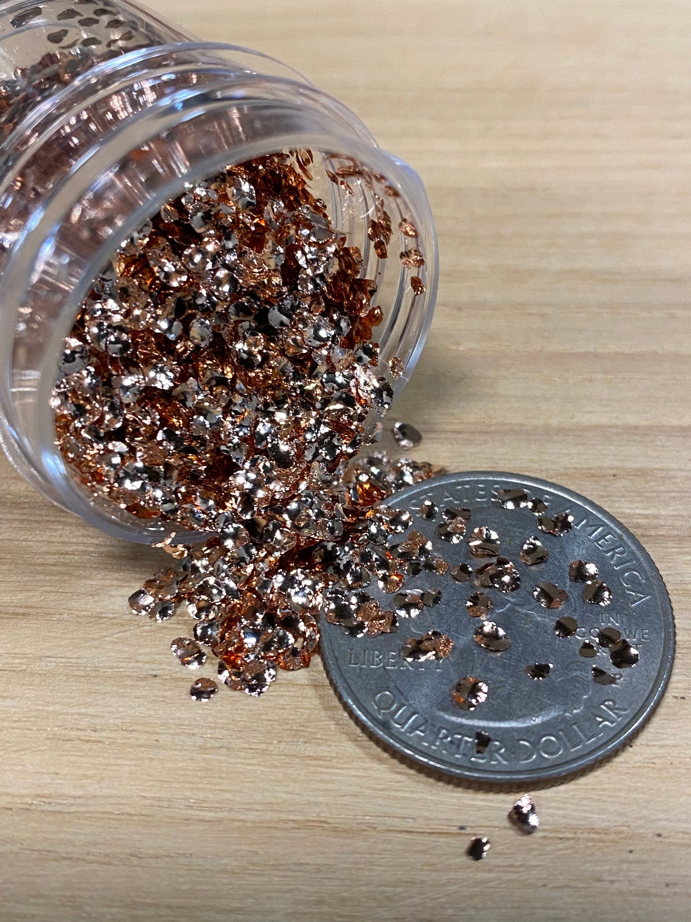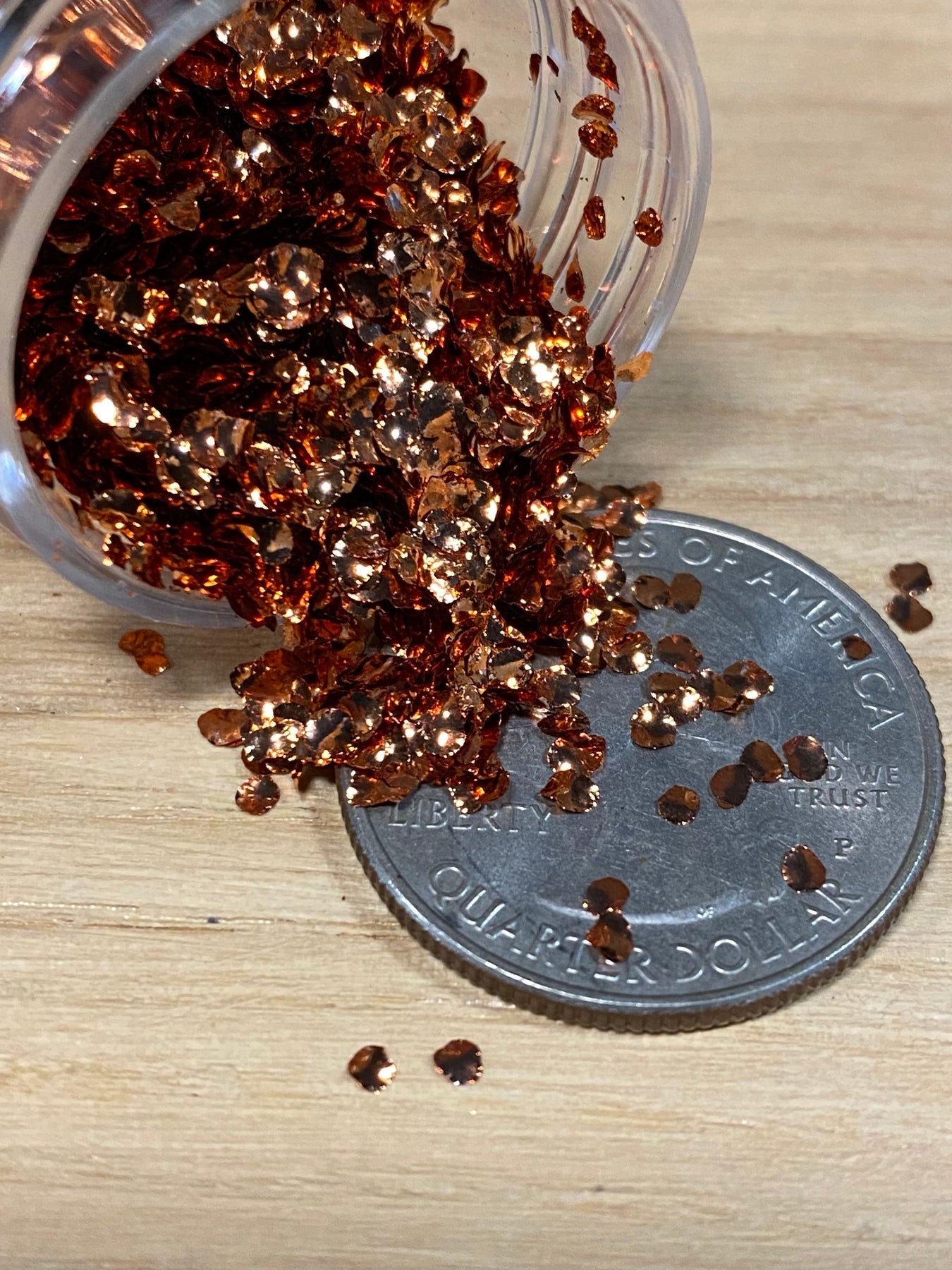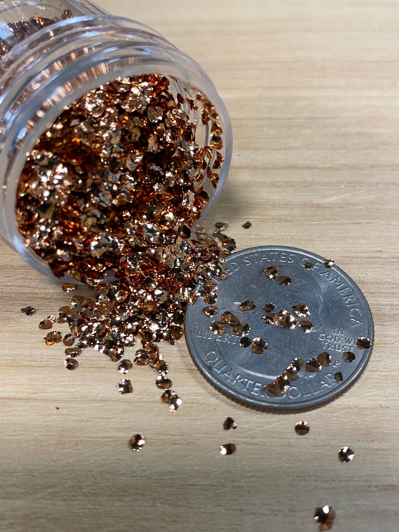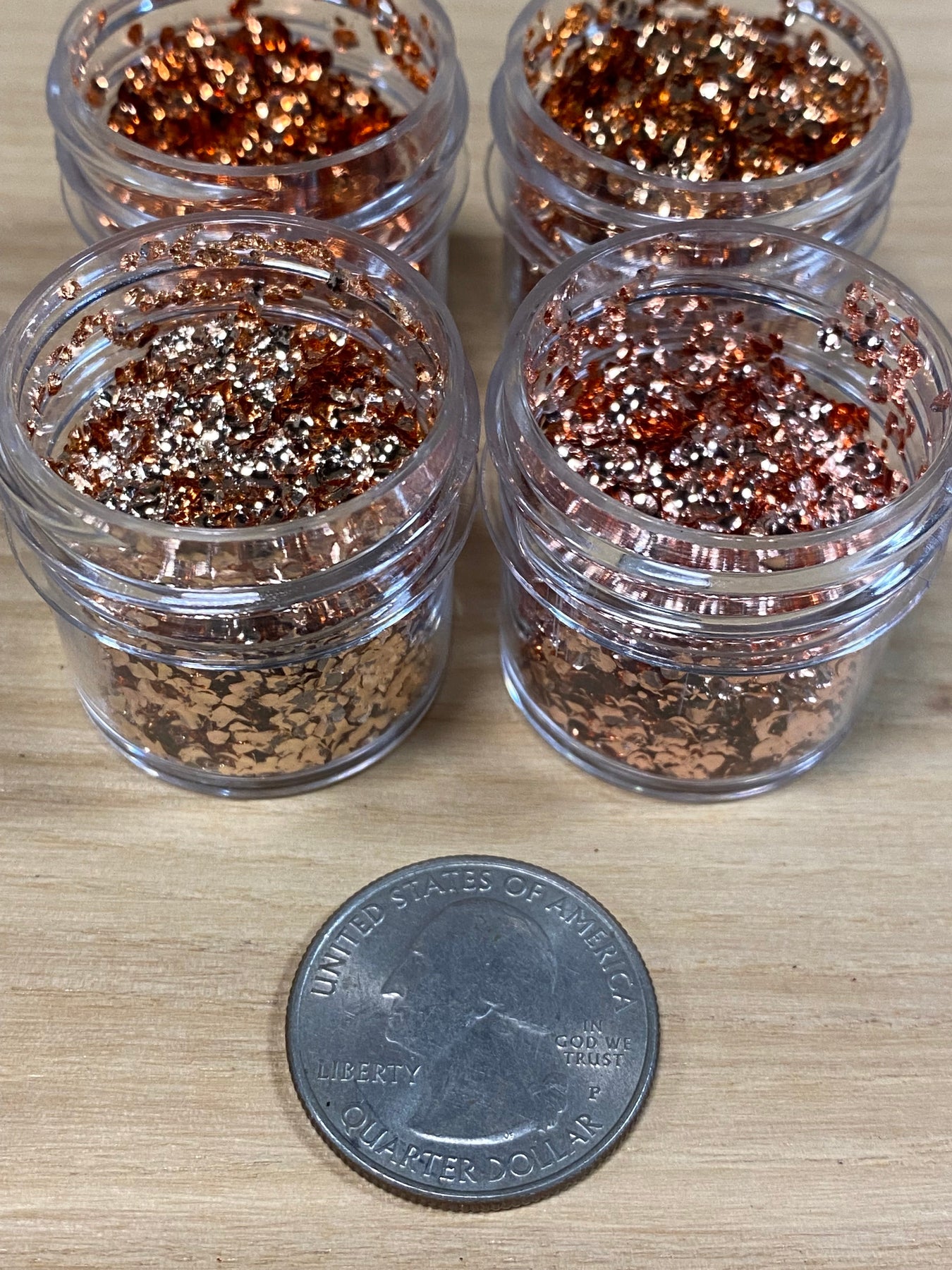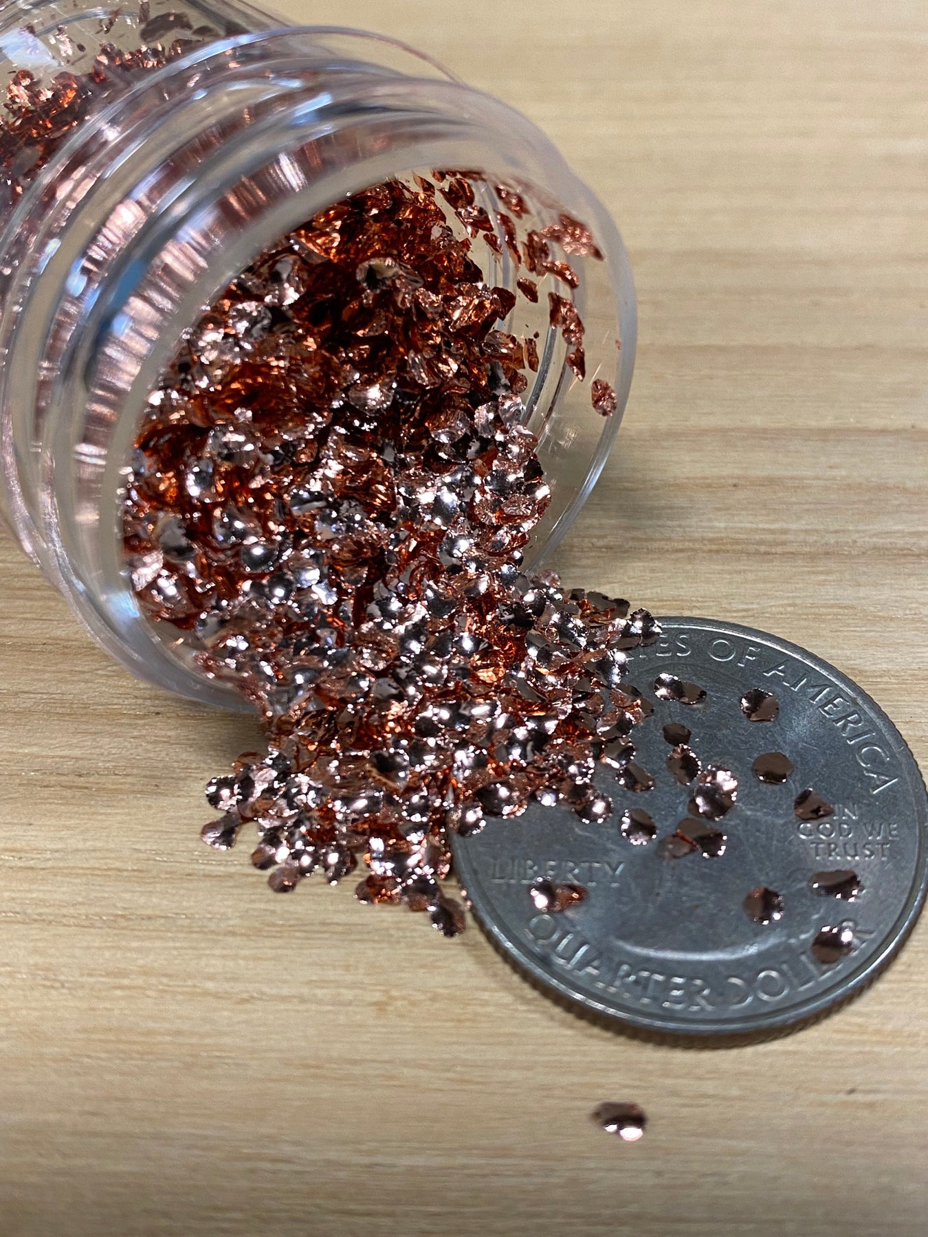 Four of our brand new 360 series flakes: Copper, brass, amber copper, and gold bronze. These flakes have a slight curl in them and when embedded in resin will reflect light in all different directions.