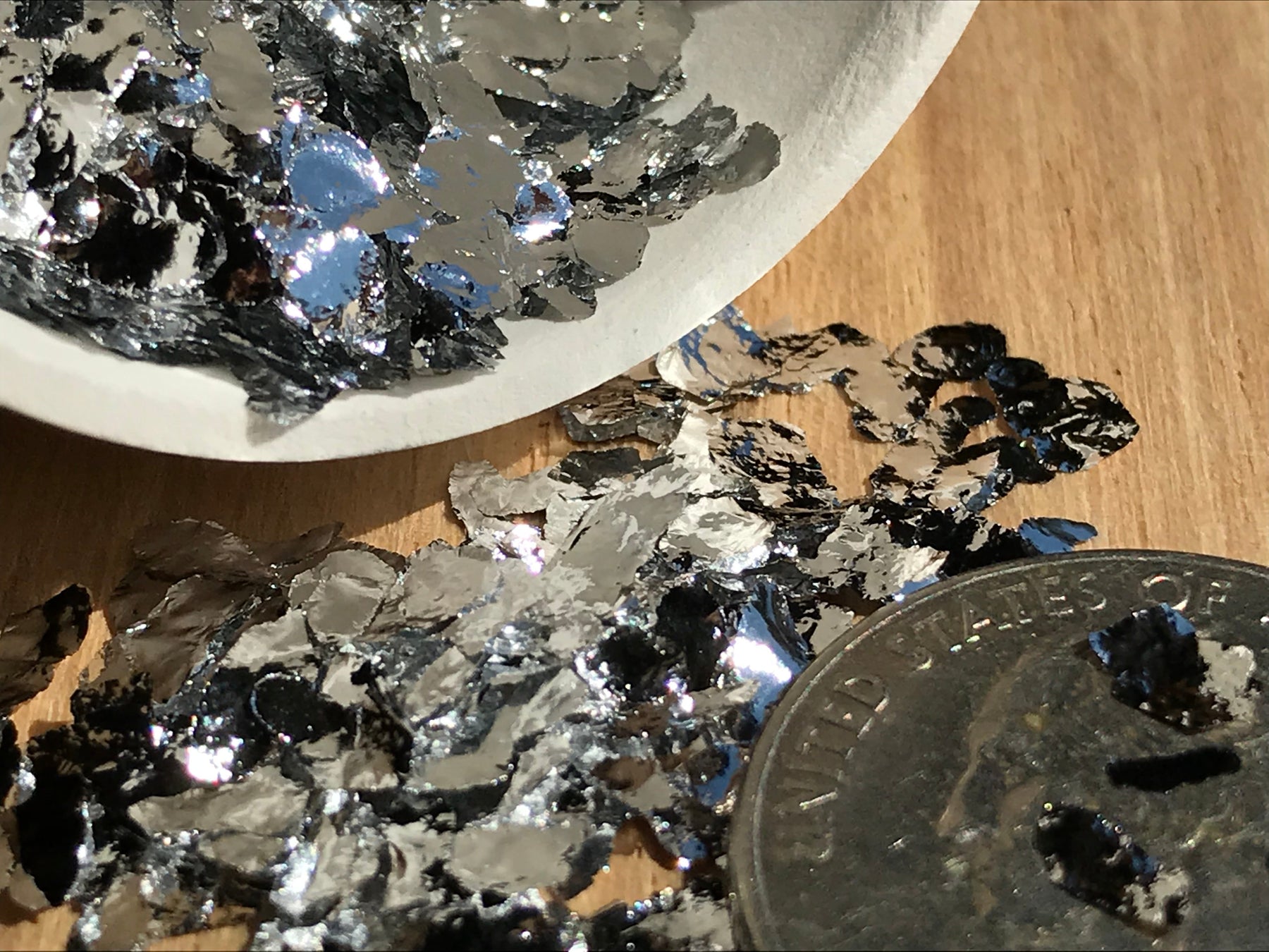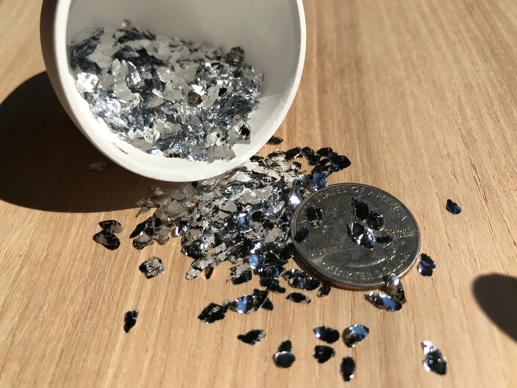 These are our biggest aluminum flakes, they're around 3-5 mm and irregular in shape. They have a true mirror polish and are very thin. These foil flakes offer an alternative to traditional silver leaf that crinkles easily and is difficult to handle.