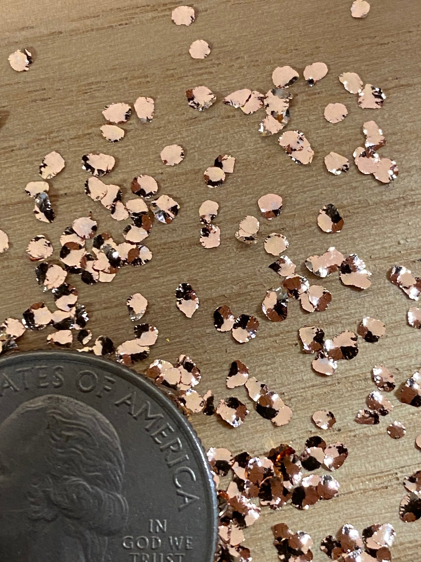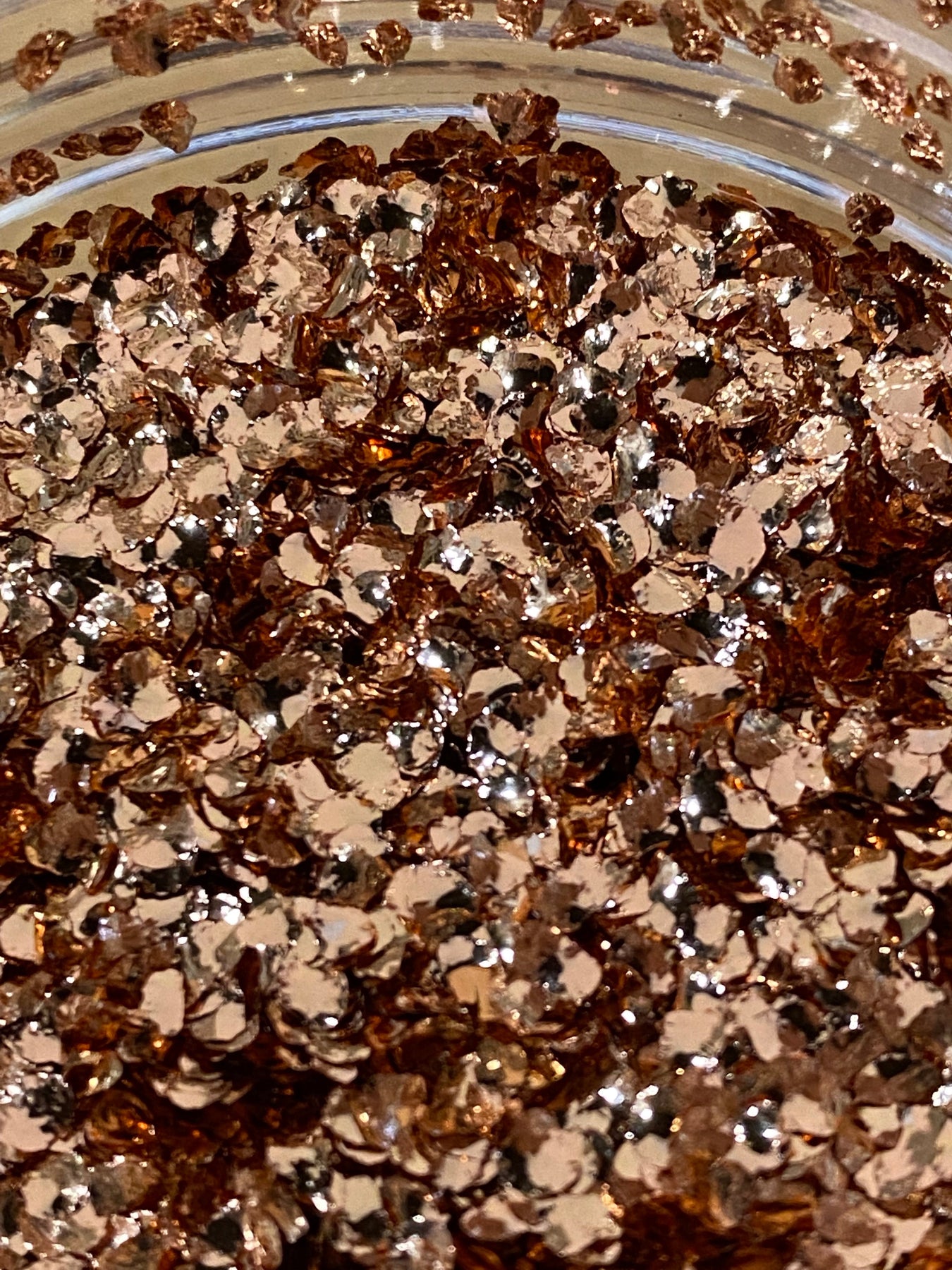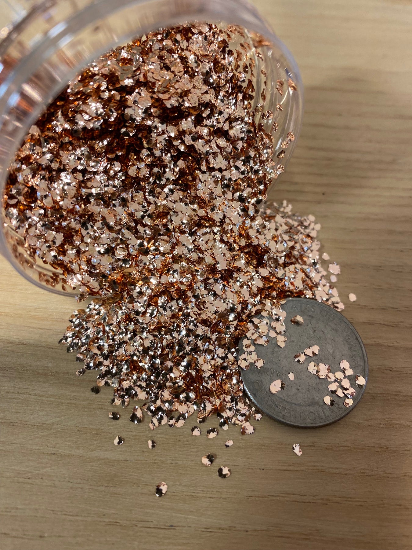 These genuine brass metal flakes have a slight curl to them, giving them a three dimensional appearance. When embedded in resin they reflect light in all different angles.