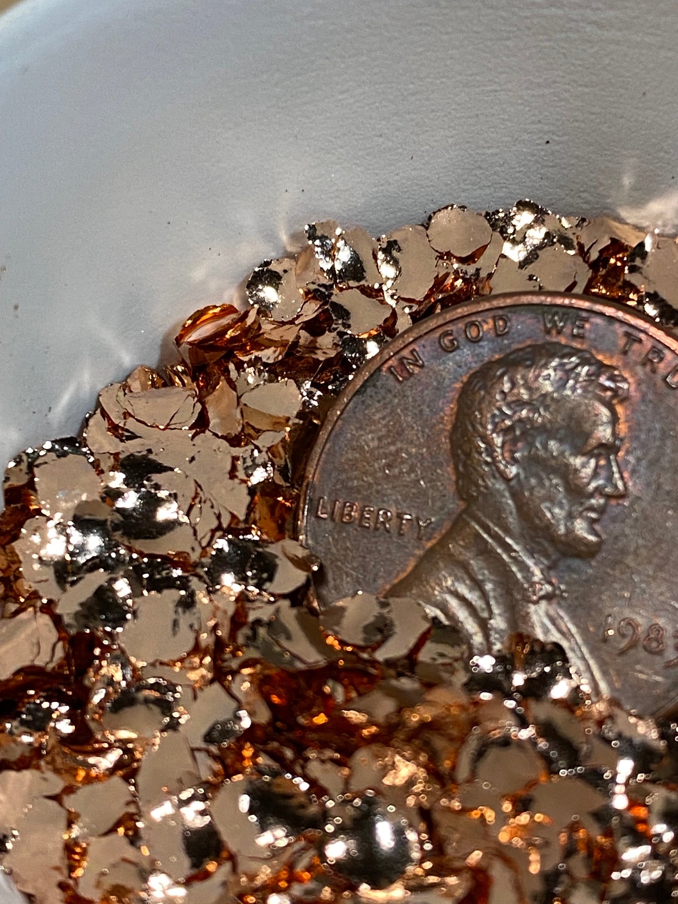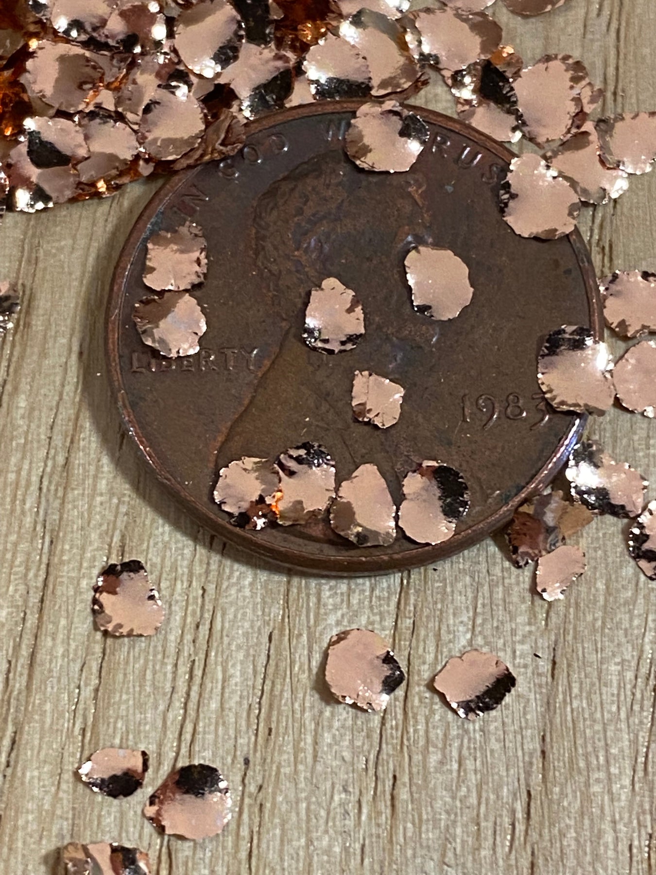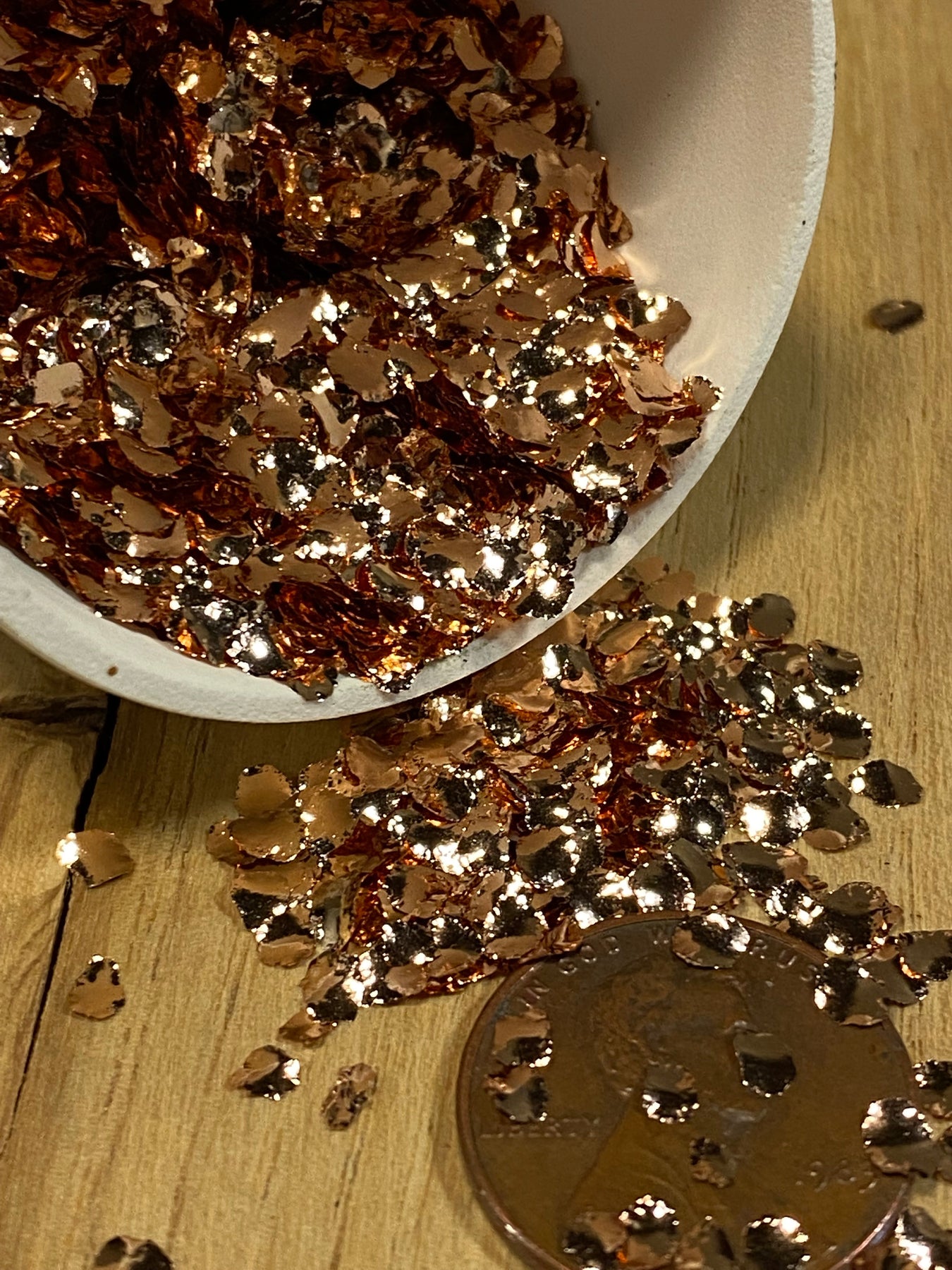 Brass 45 are the biggest brass metal flakes we produce. They are approximately 3-4mm in diameter with a brilliant mirror polish.