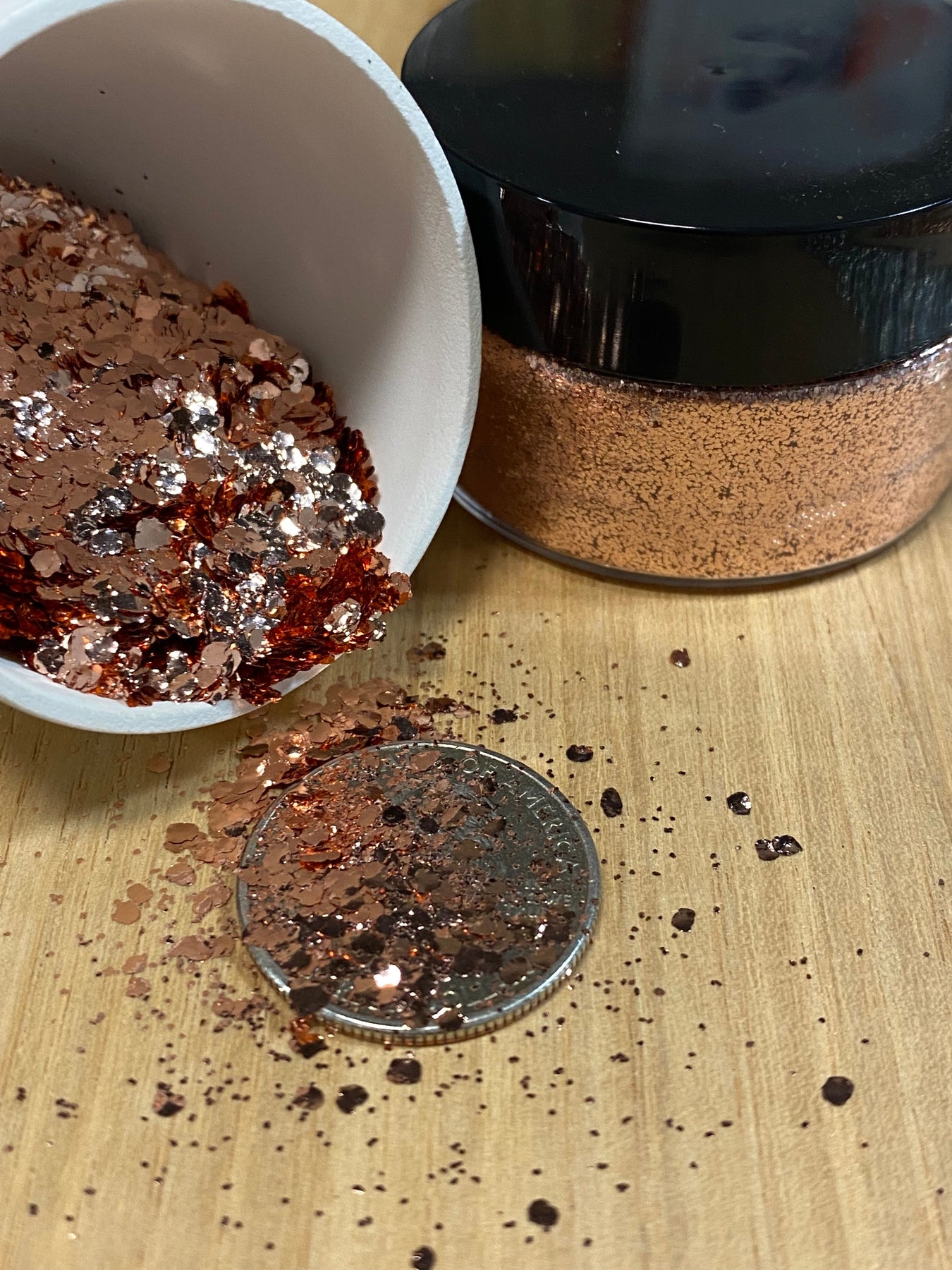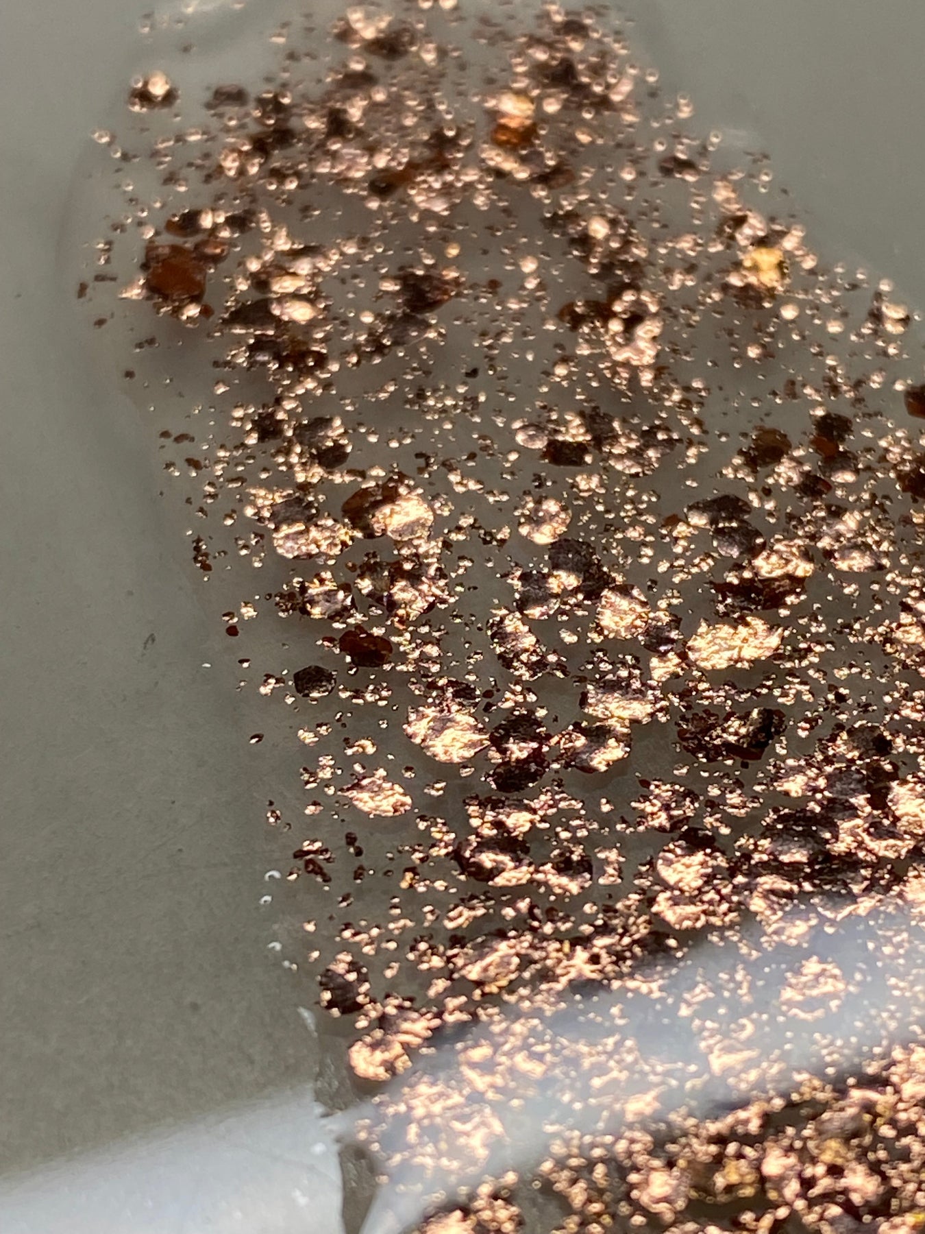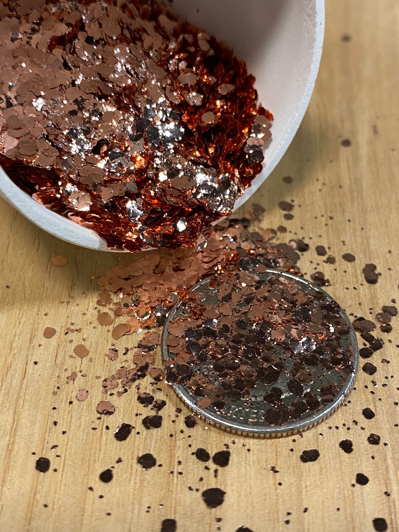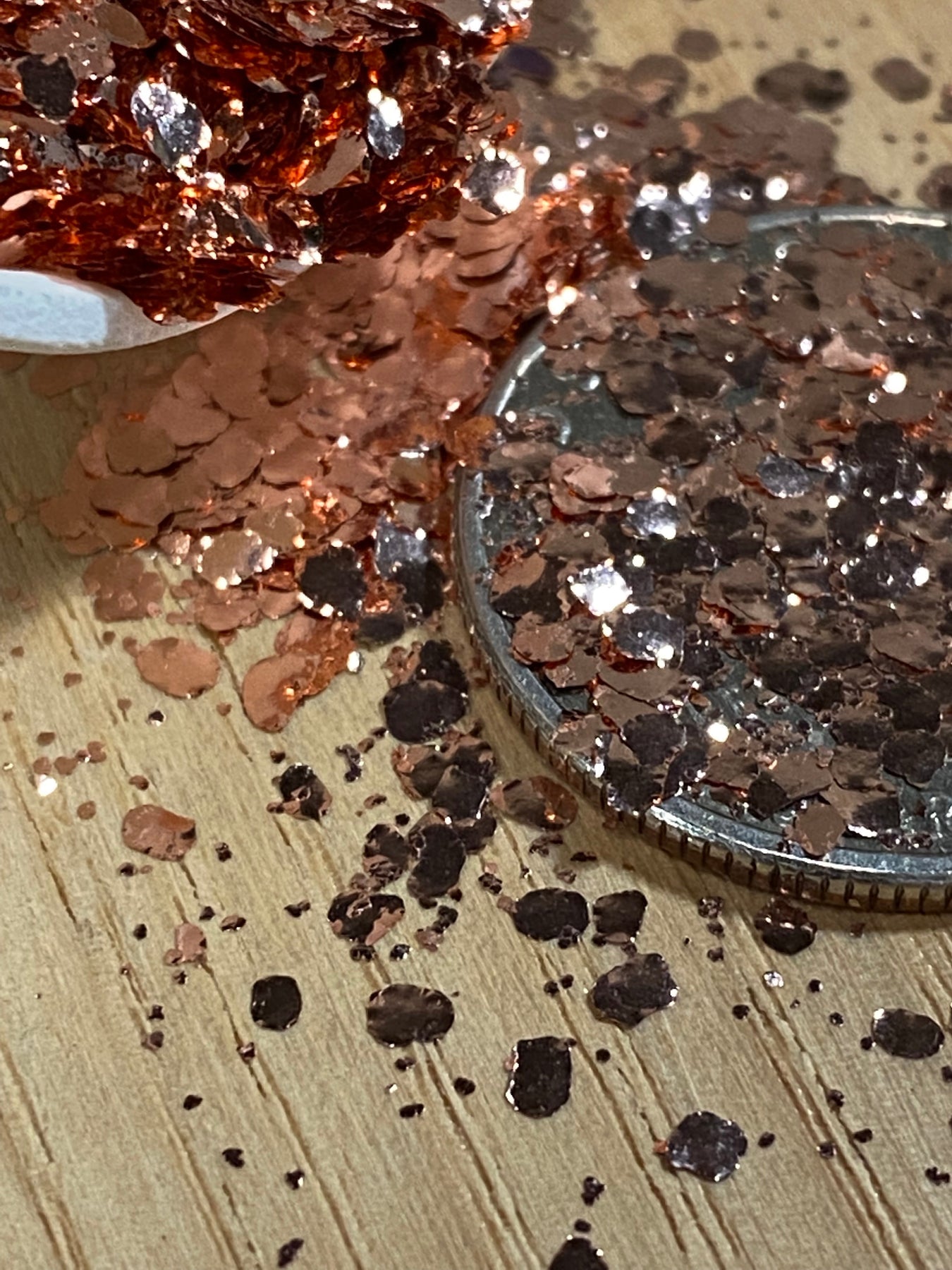 A blend of three sizes of our pure copper metal flakes. It includes our super fine .2mm flakes, .5mm and large 2mm flakes to create a stunning metallic copper effect.