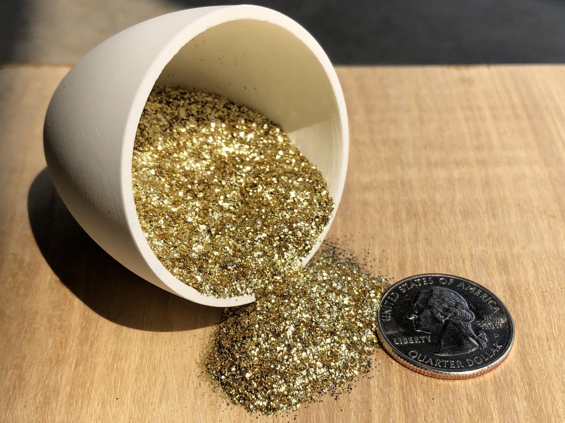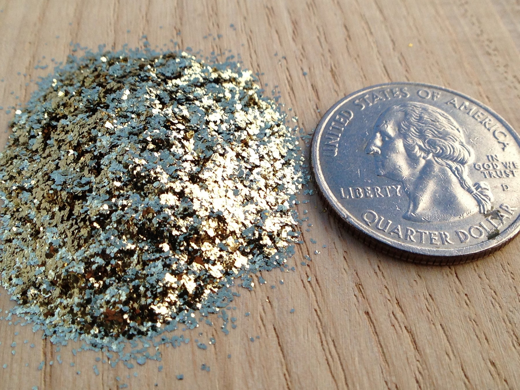 40 grams of genuine yellow brass. The flakes are approximately 300-400 microns (about 1/3mm) in diameter.