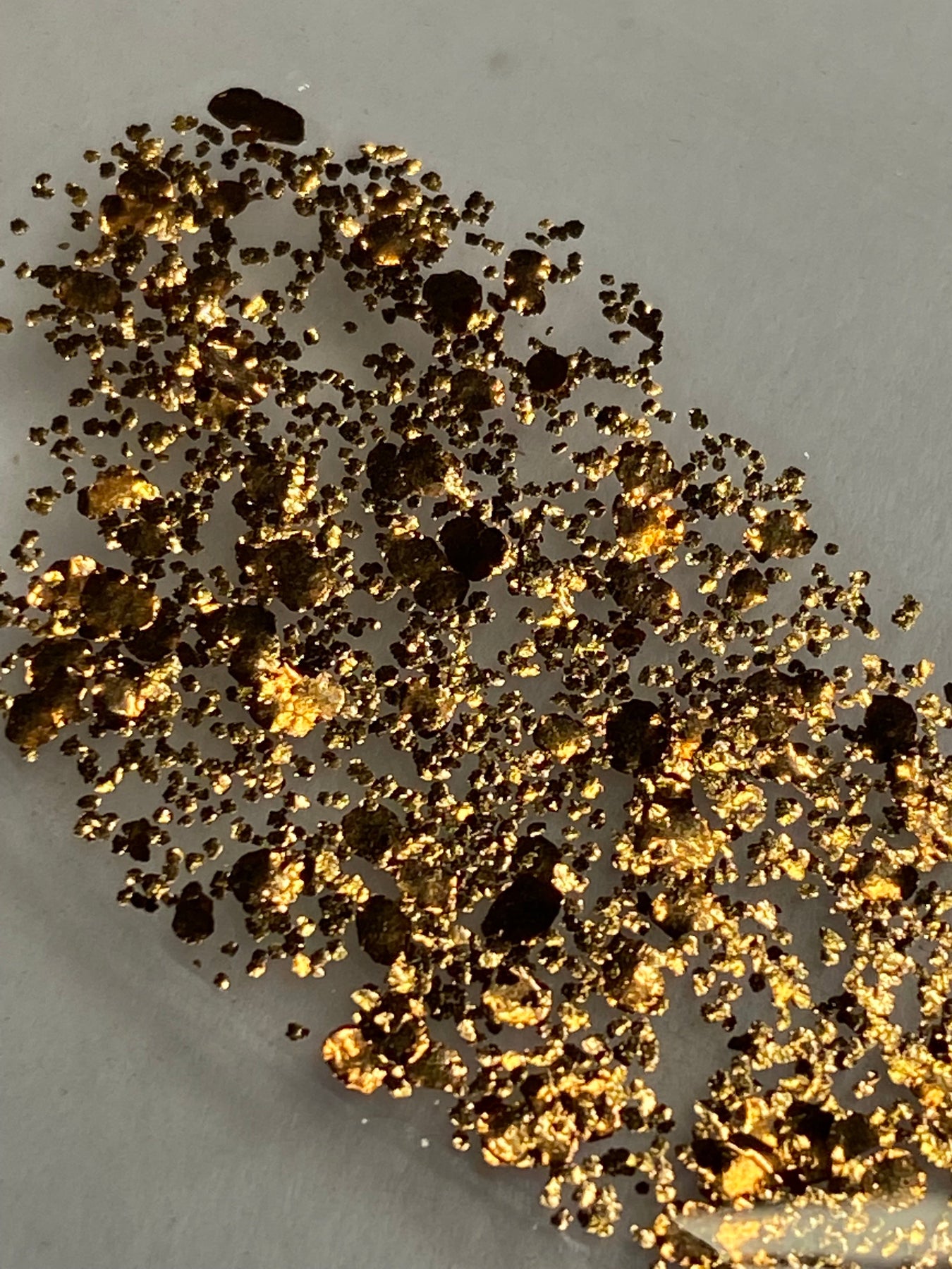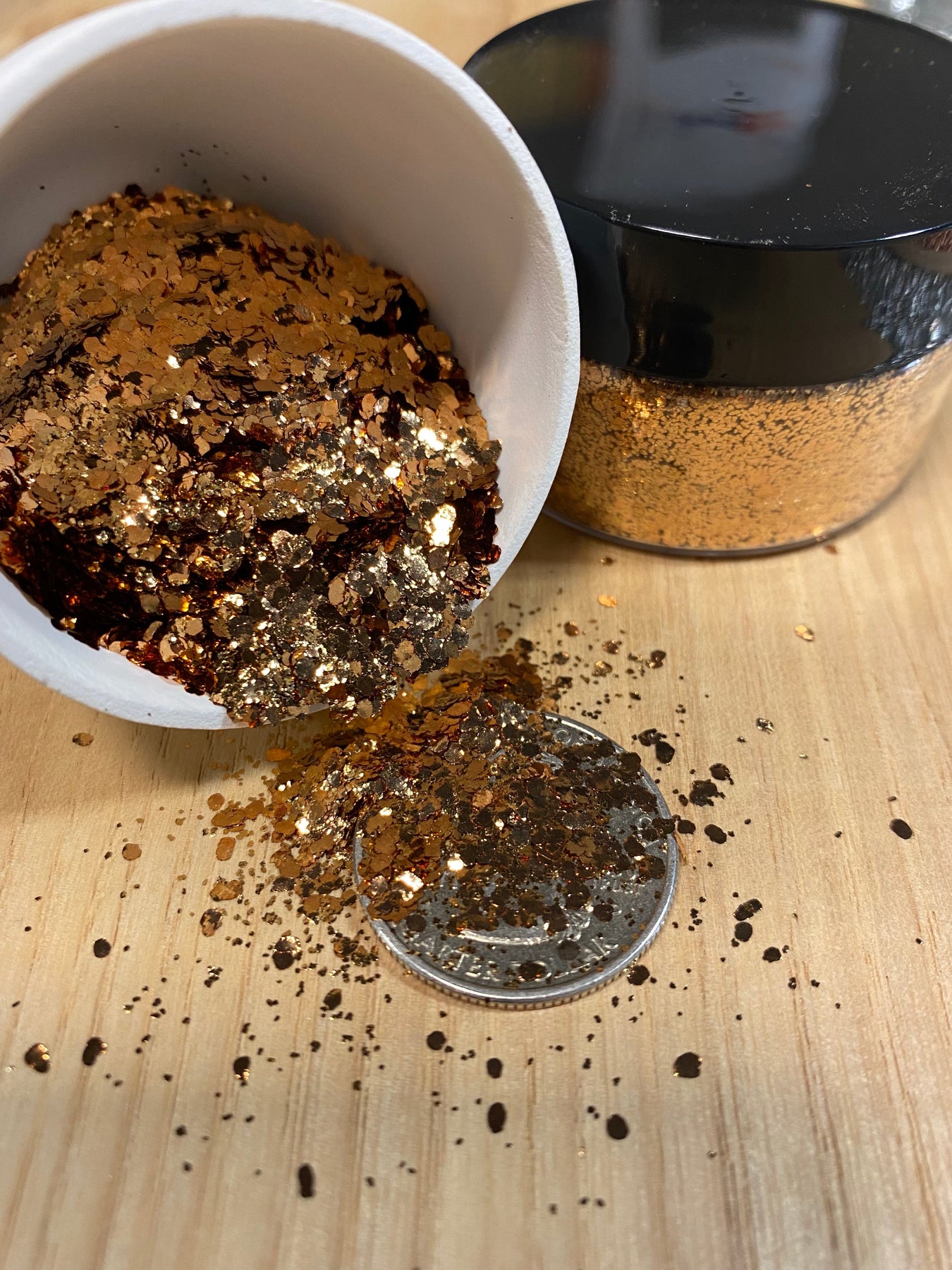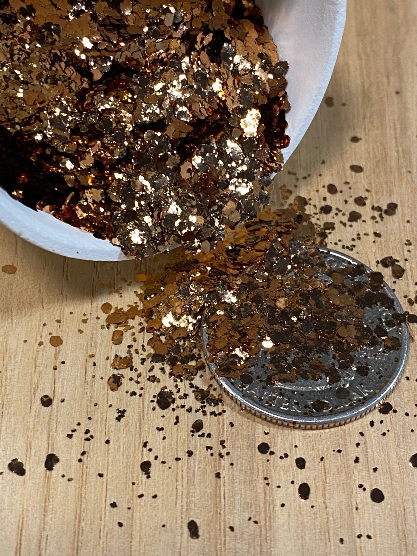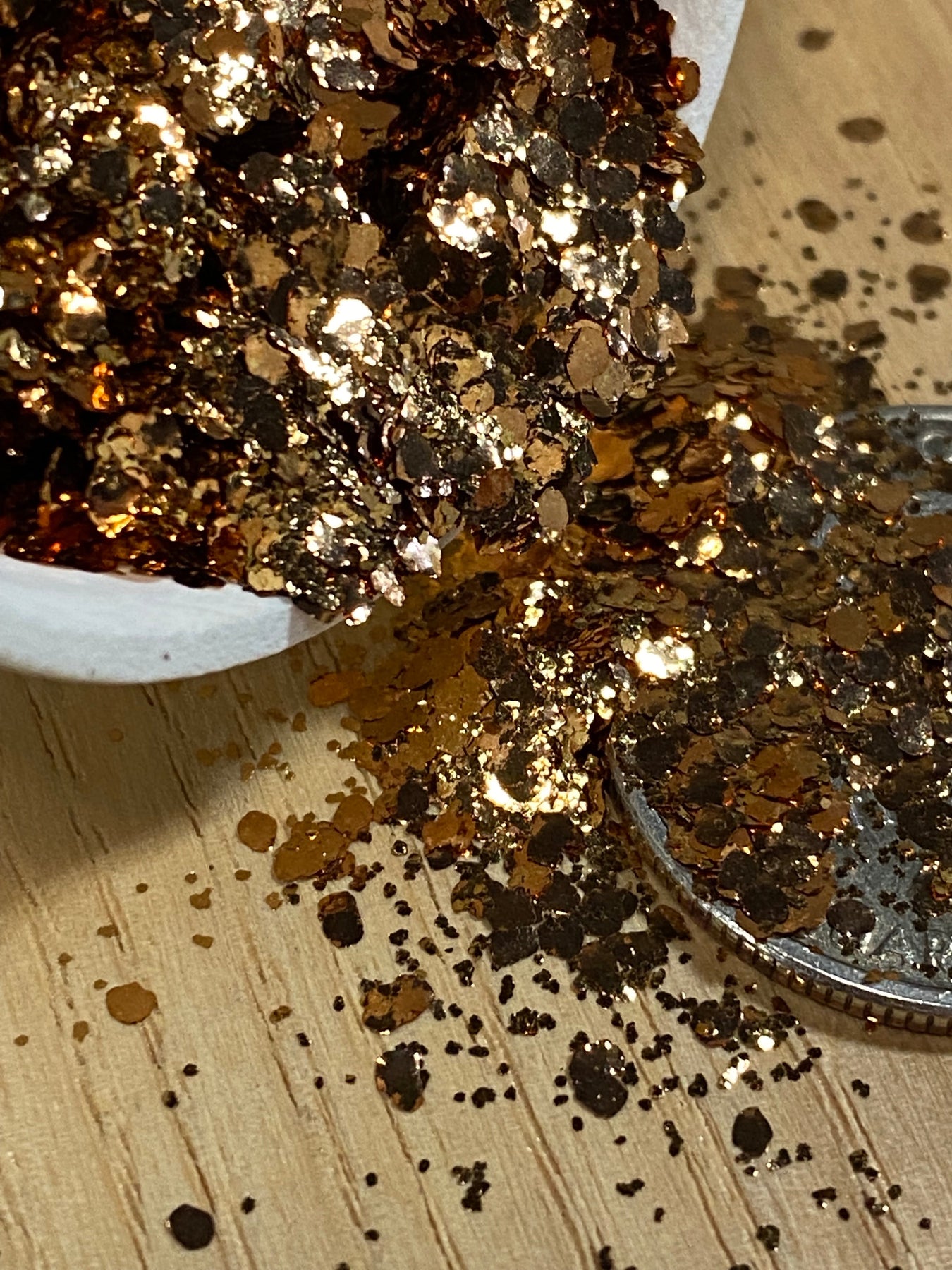 A blend of three sizes of our pure gold bronze metal flakes. It includes our super fine .2mm flakes, .5mm and large 2mm flakes to create a rich gold bronze metallic effect.