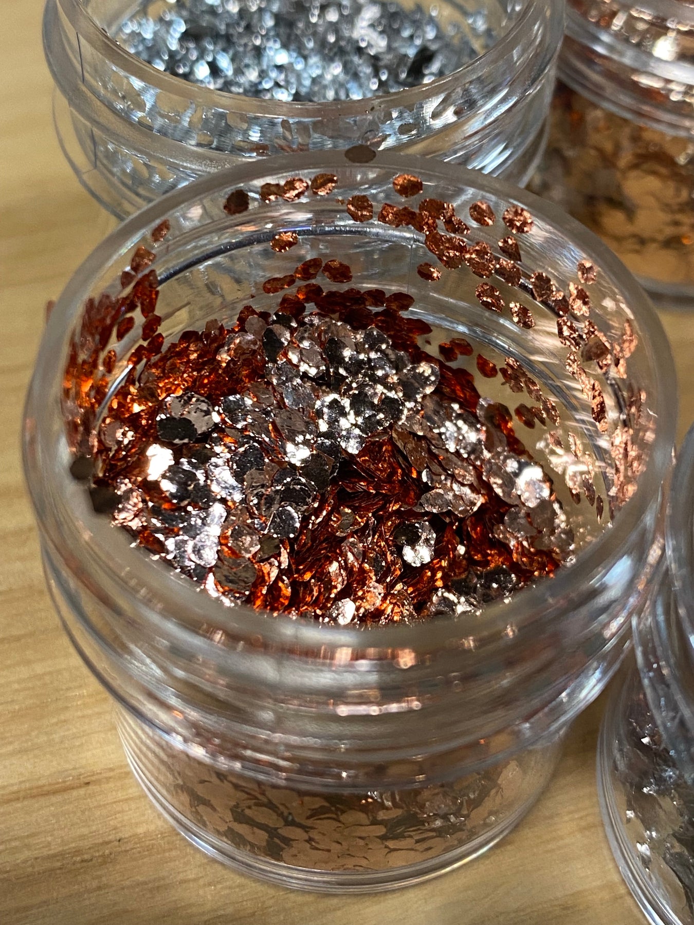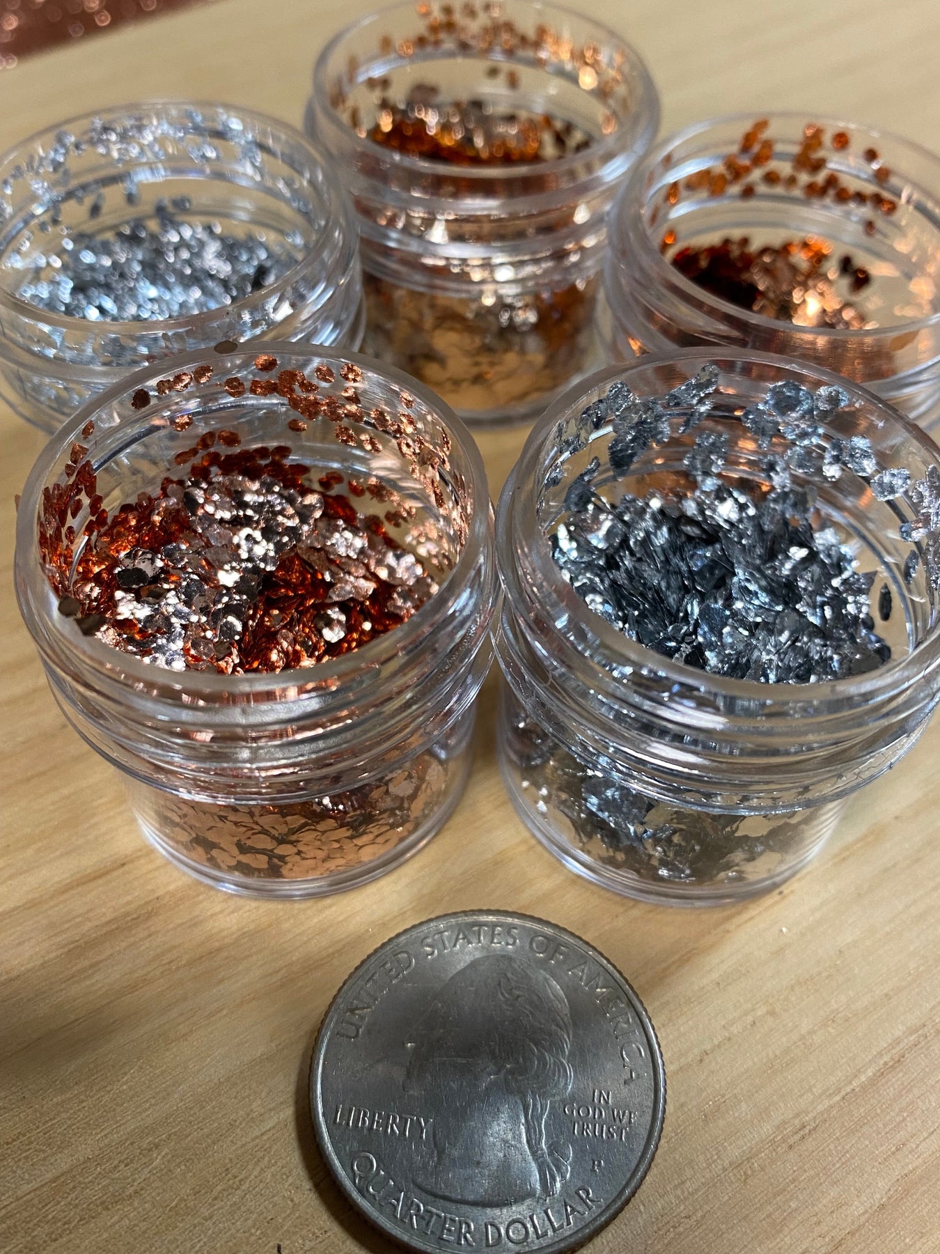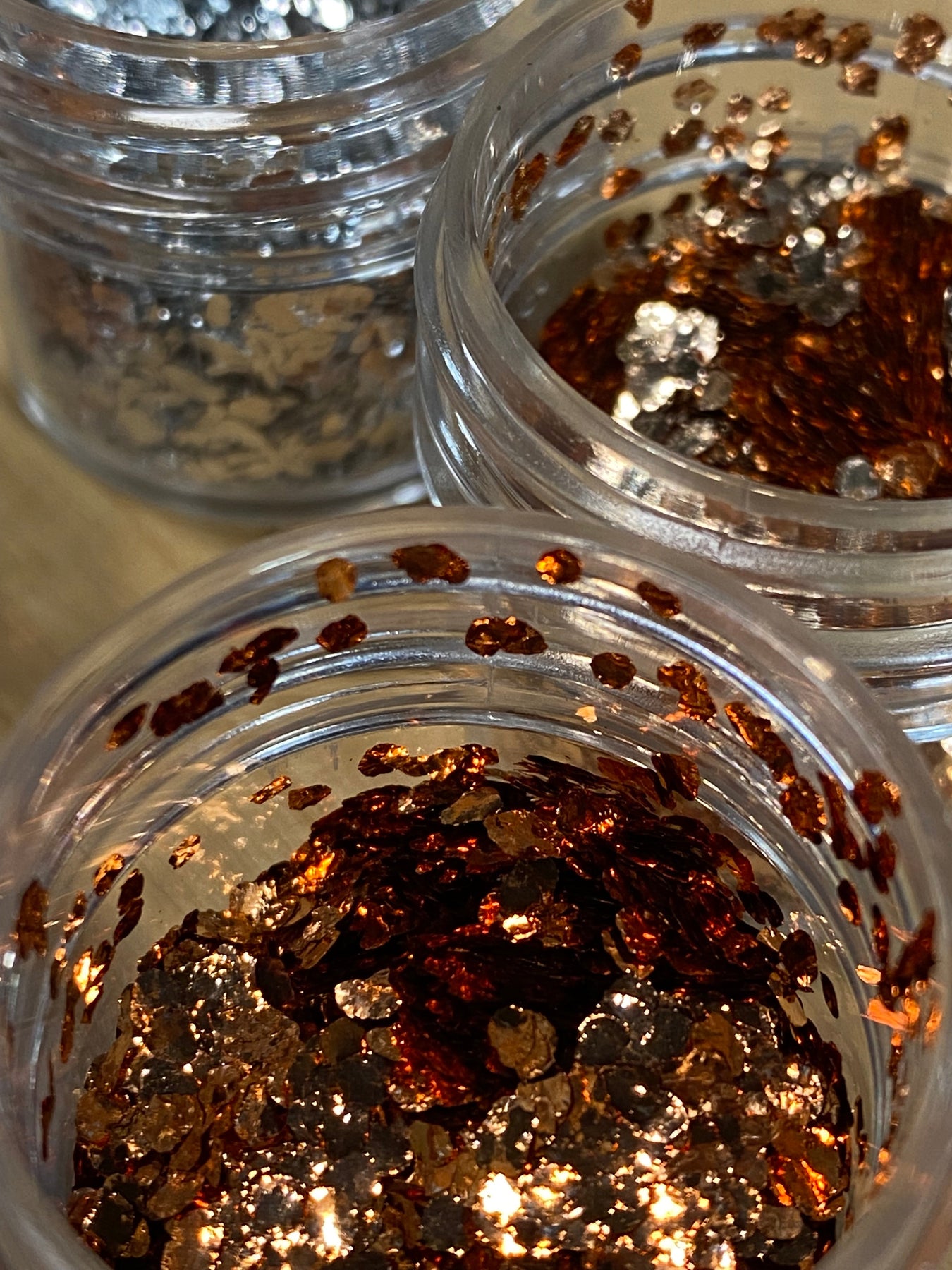 Five sample jars of our large genuine metal flakes: Copper, brass, amber copper, and two unique jars of polished aluminum flakes. These flakes are designed to sink in resin, and will give your projects the shine of real metal.