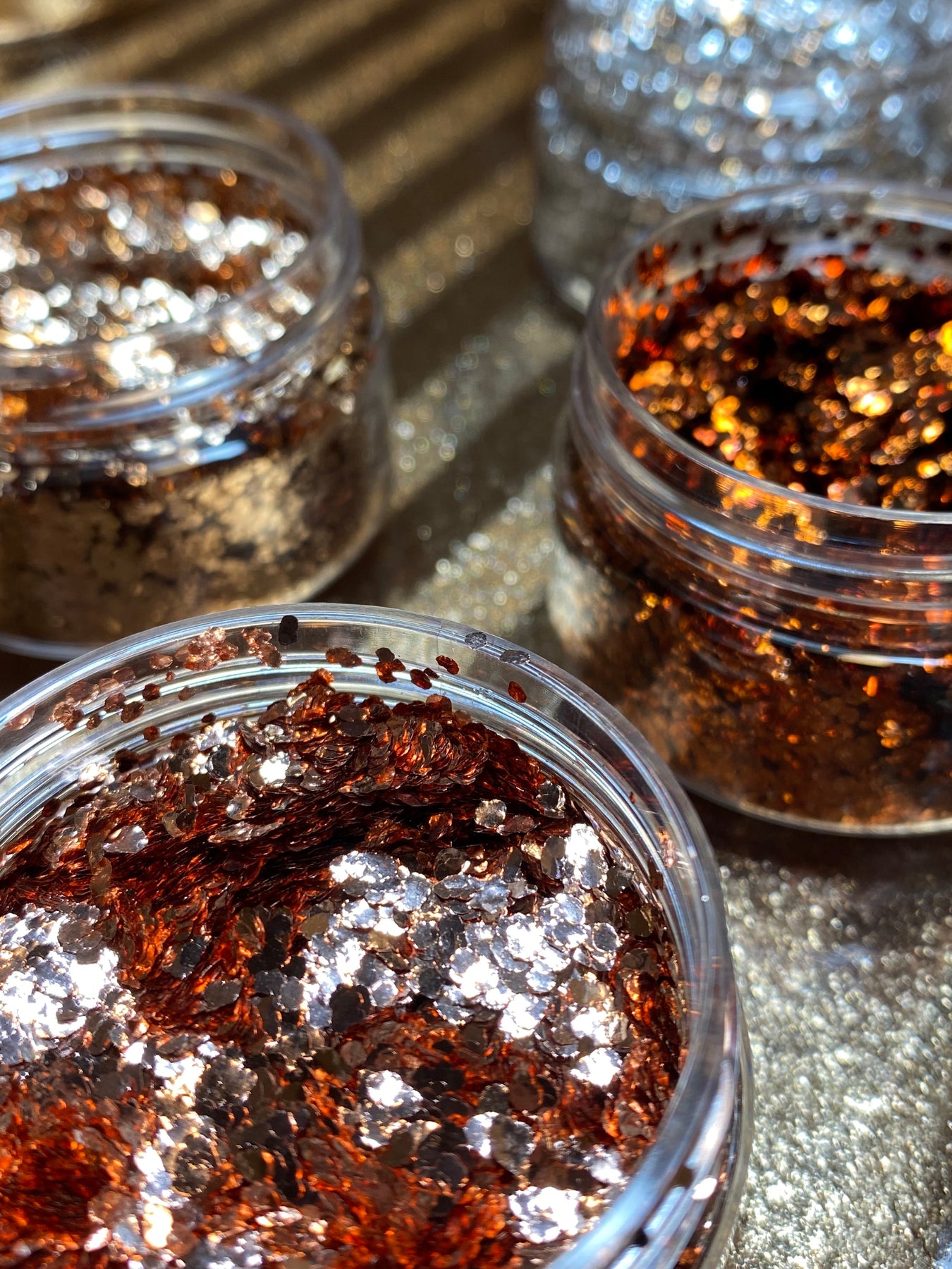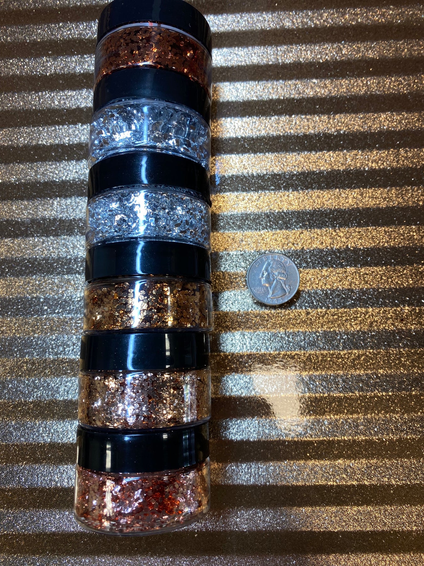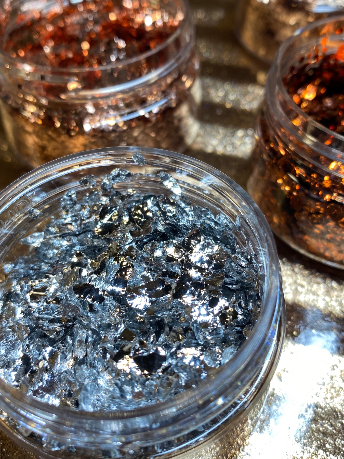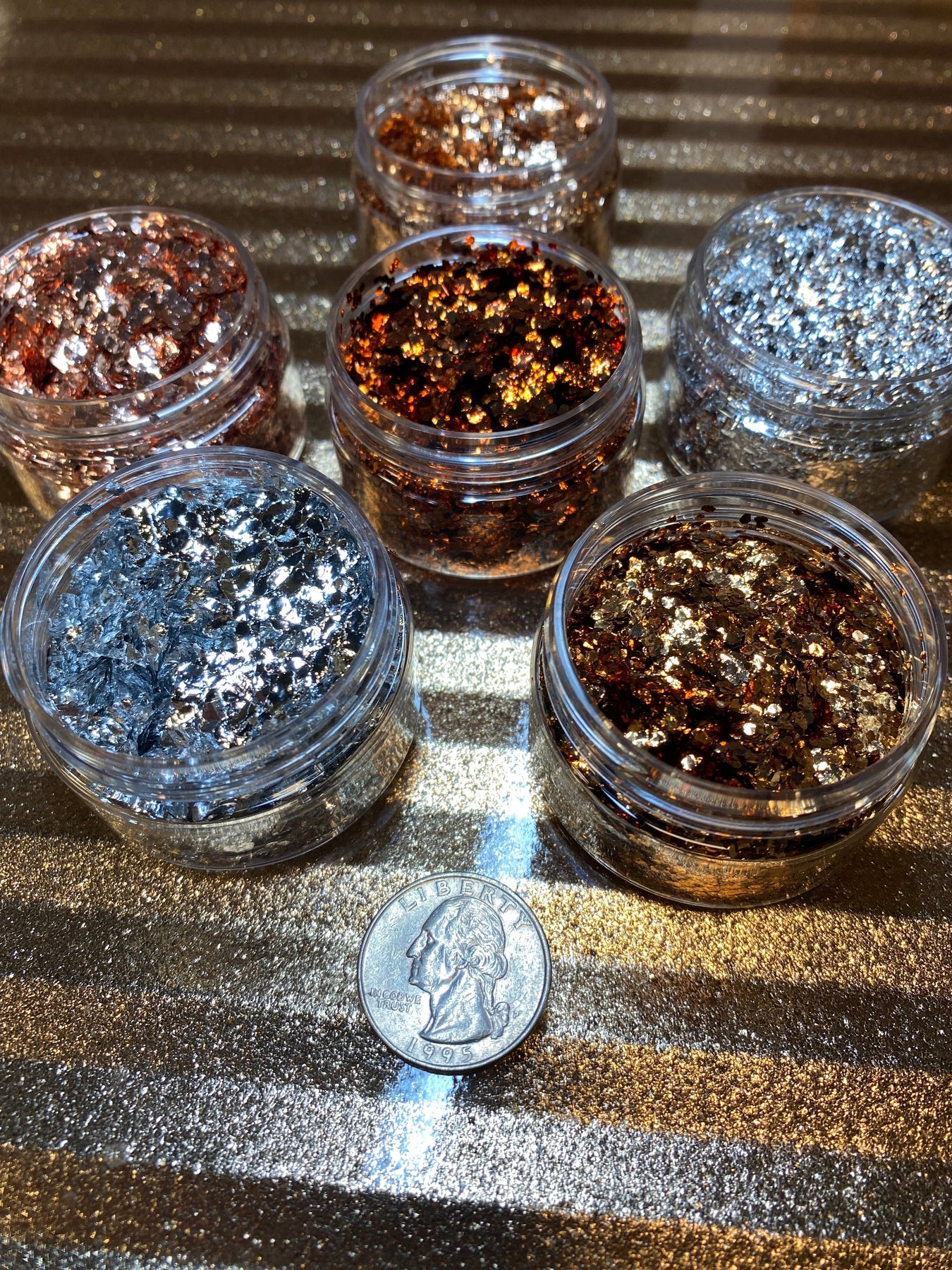 Six of our large flakes: copper, brass, amber copper, gold bronze, and two of our aluminum flakes.