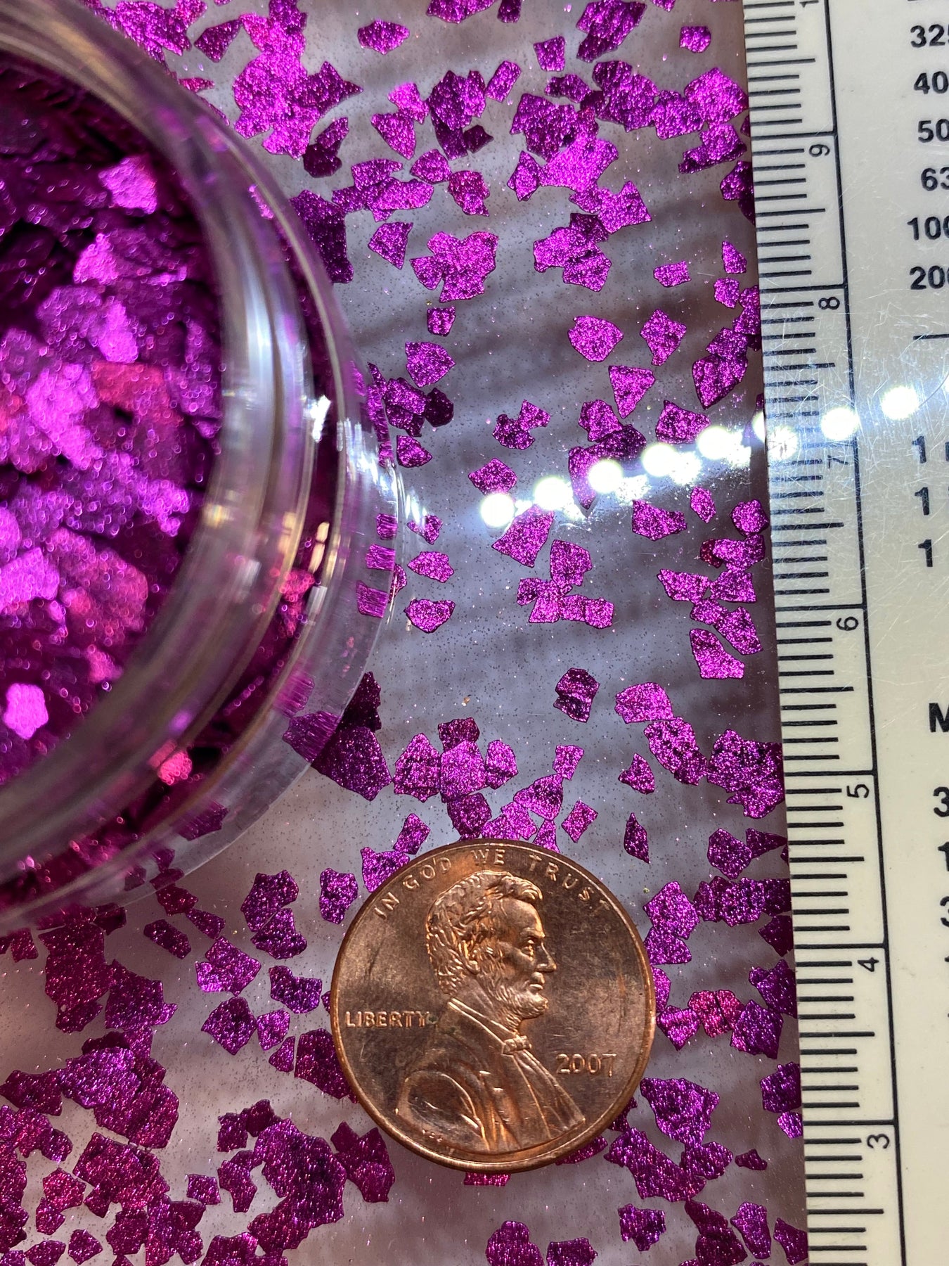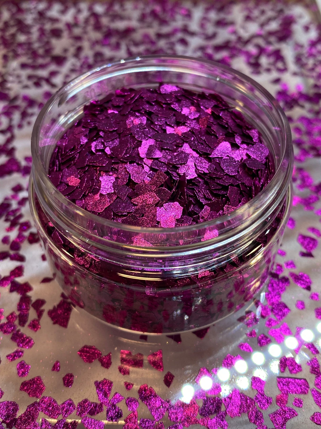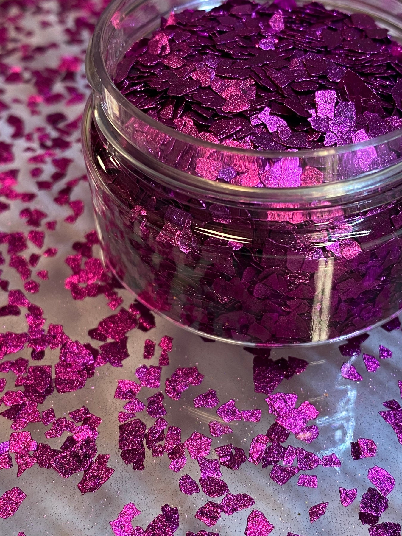 Magenta pink flakes covered in a mirror pigment create thousands of points of reflection to create gem like sparkling effects. Perfect for resin art, epoxy projects, and jewelry making.