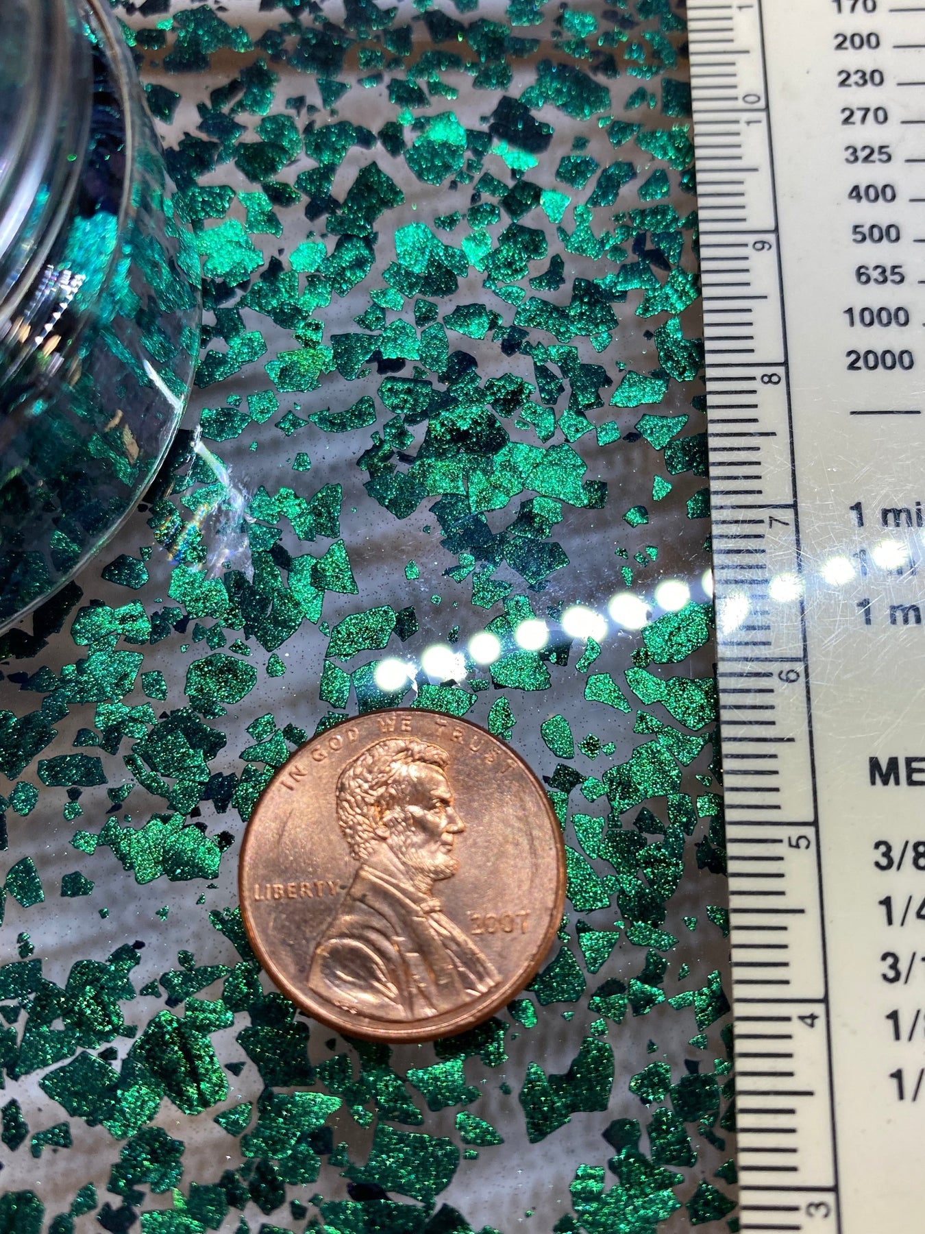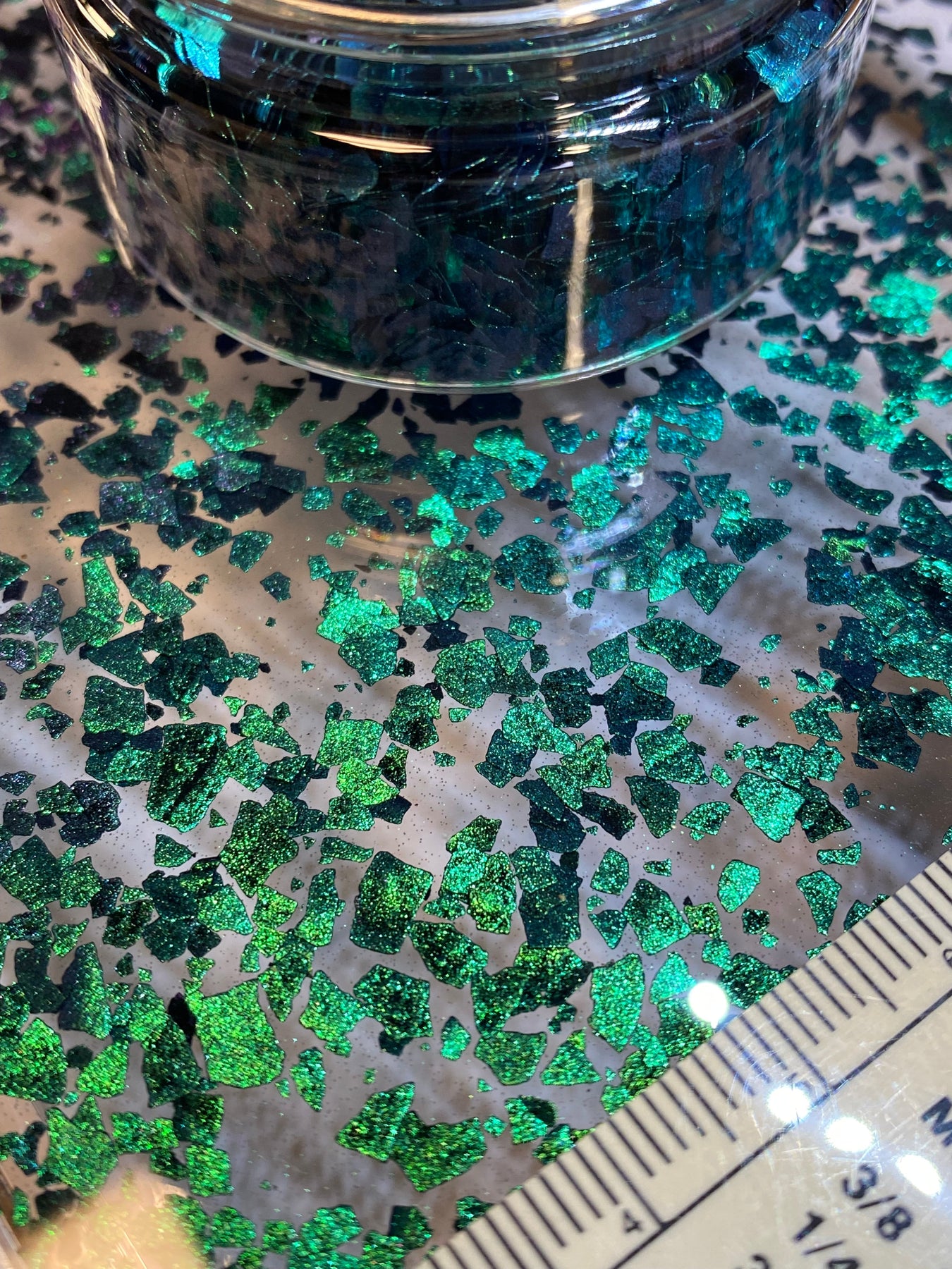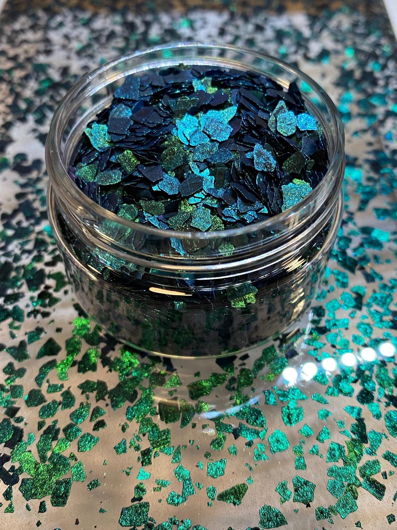 These flakes create stunning shimmering dark green effects that shift between malachite green and teal tones, perfect for resin art, epoxy projects, and jewelry making.