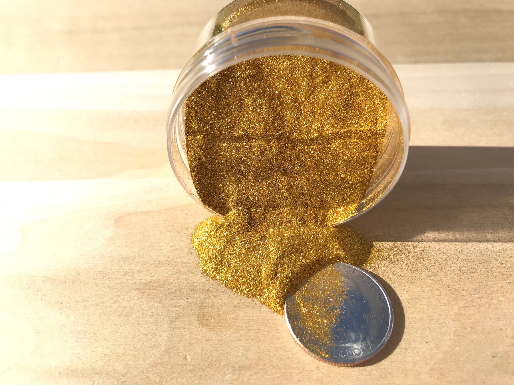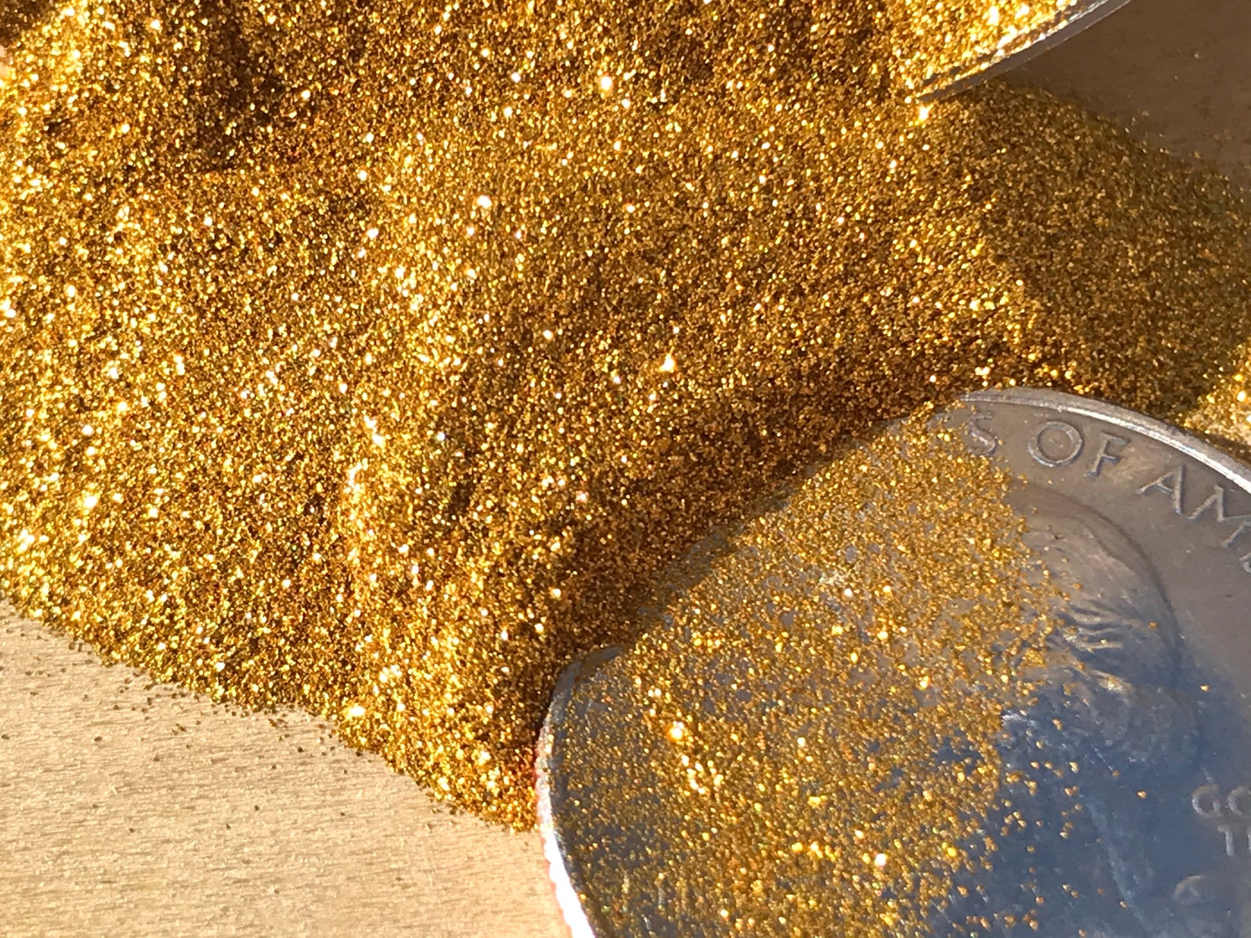 These are an intense yellow gold made from real brass. Flakes are on average 200 microns. (1/5 of a millimeter)