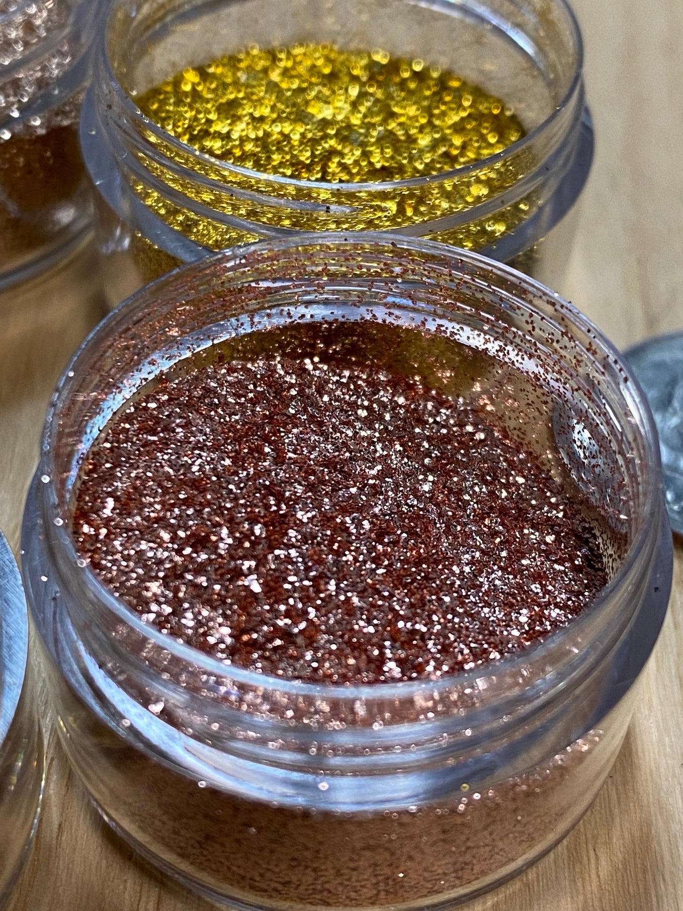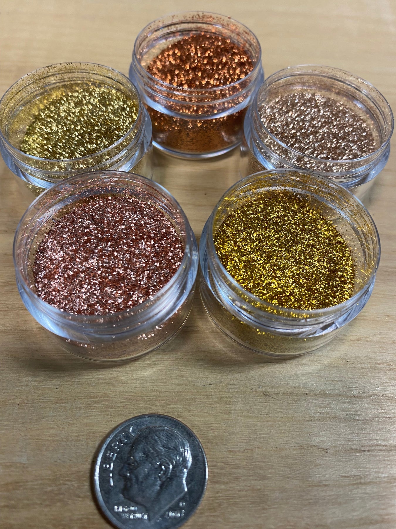 Five samples jars of our super fine metal flakes: Copper, brass, amber copper, and ultra gold brass.