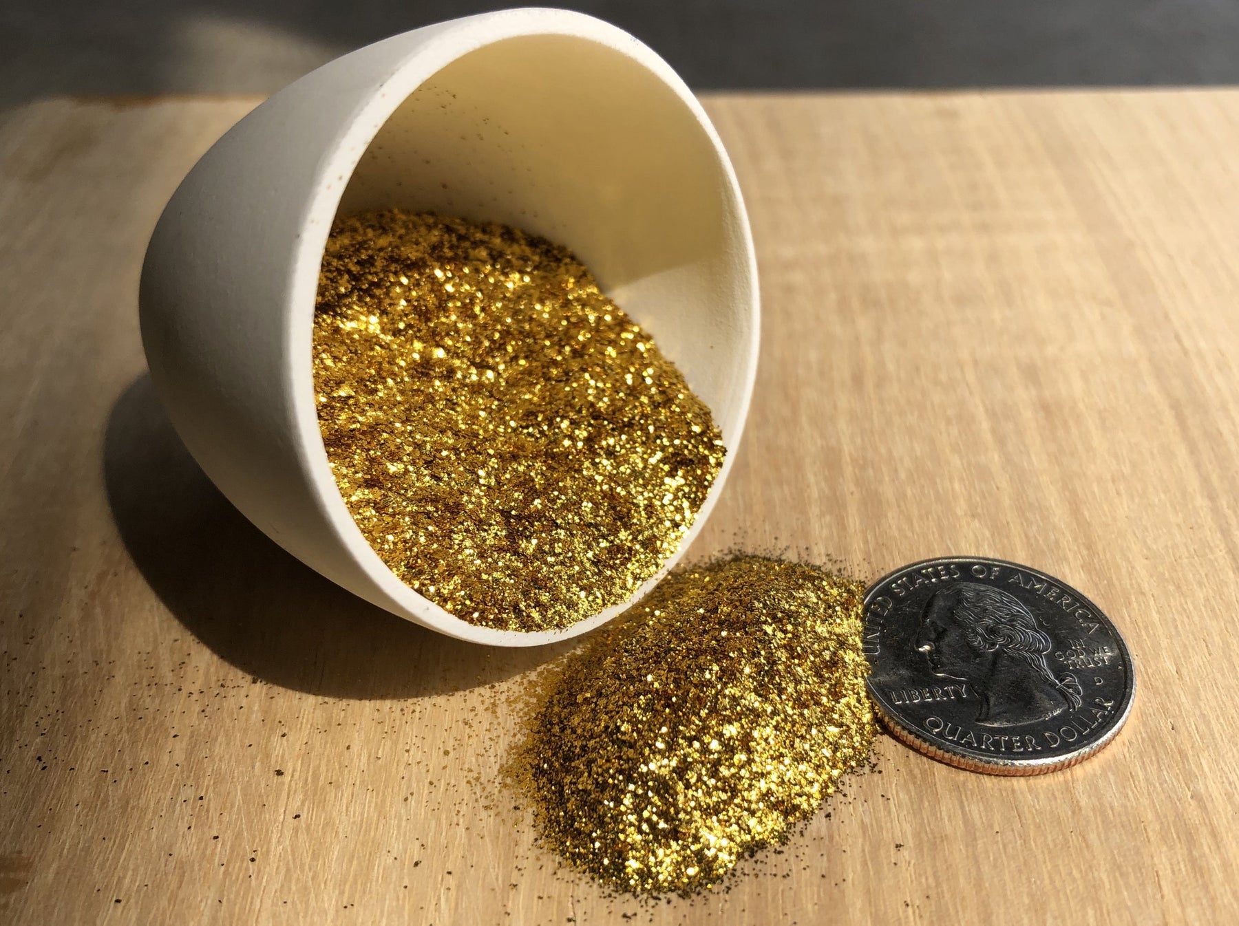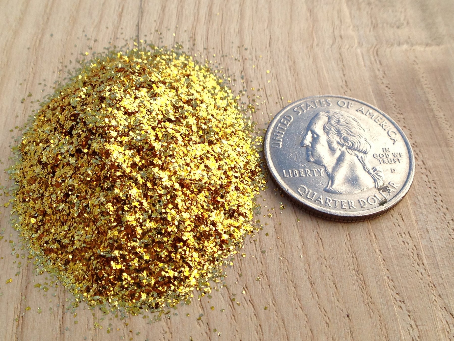 These are a yellower more intense gold than our standard gold brass flakes. The flakes are approximately 300-400 microns (about 1/3mm) in diameter.